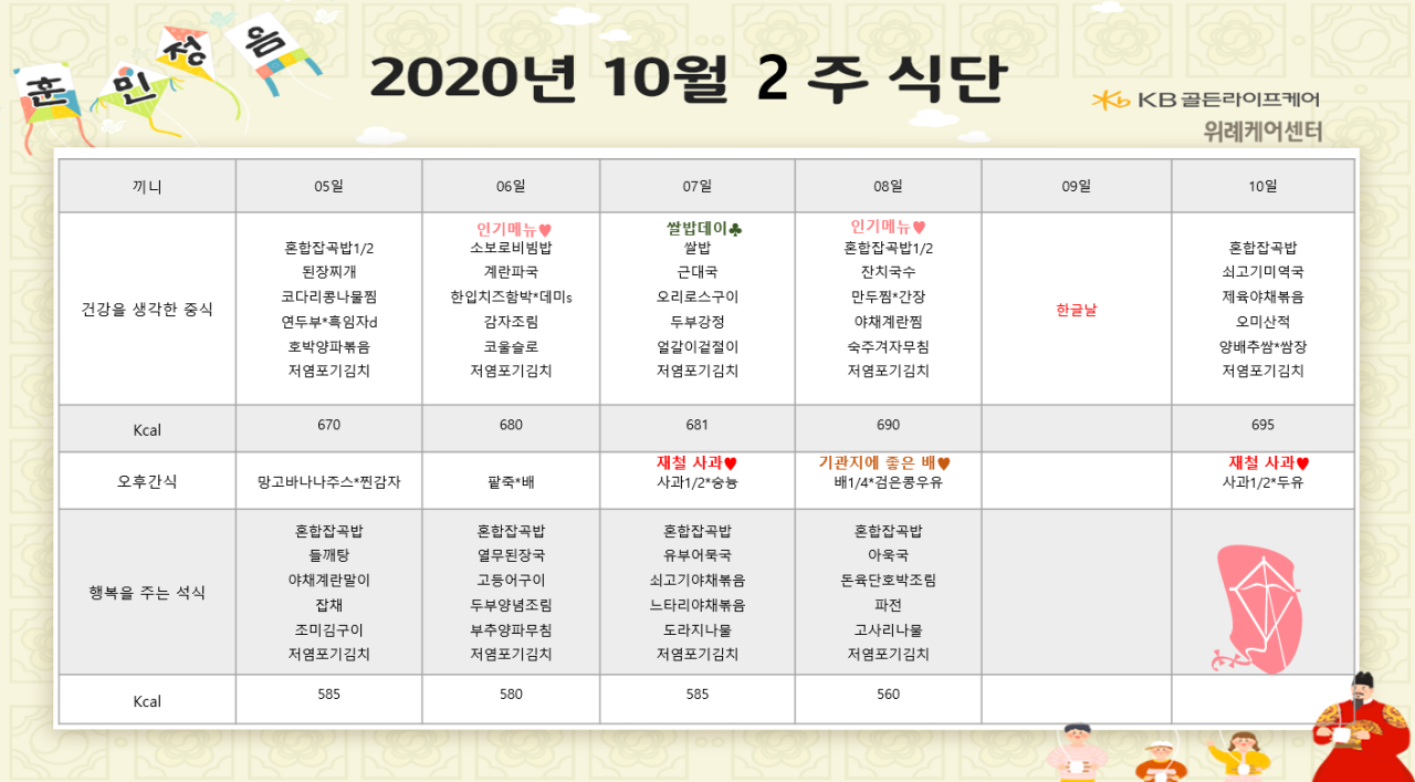 위례케어센터 [식단안내] 위례 케어센터 10월 2주차 식단표 페이지 정보 작성자 KB 골든라이프 댓글 0건 조회 3,729회 작성일 20-10-02 13:15 목록 본문 목록 이전글[프로그램 안내] 2020년 위례 케어센터 10월 프로그램 일정표 20.10.05 다음글[식단안내] 위례빌리지 10월 2주차 식단표 20.10.02