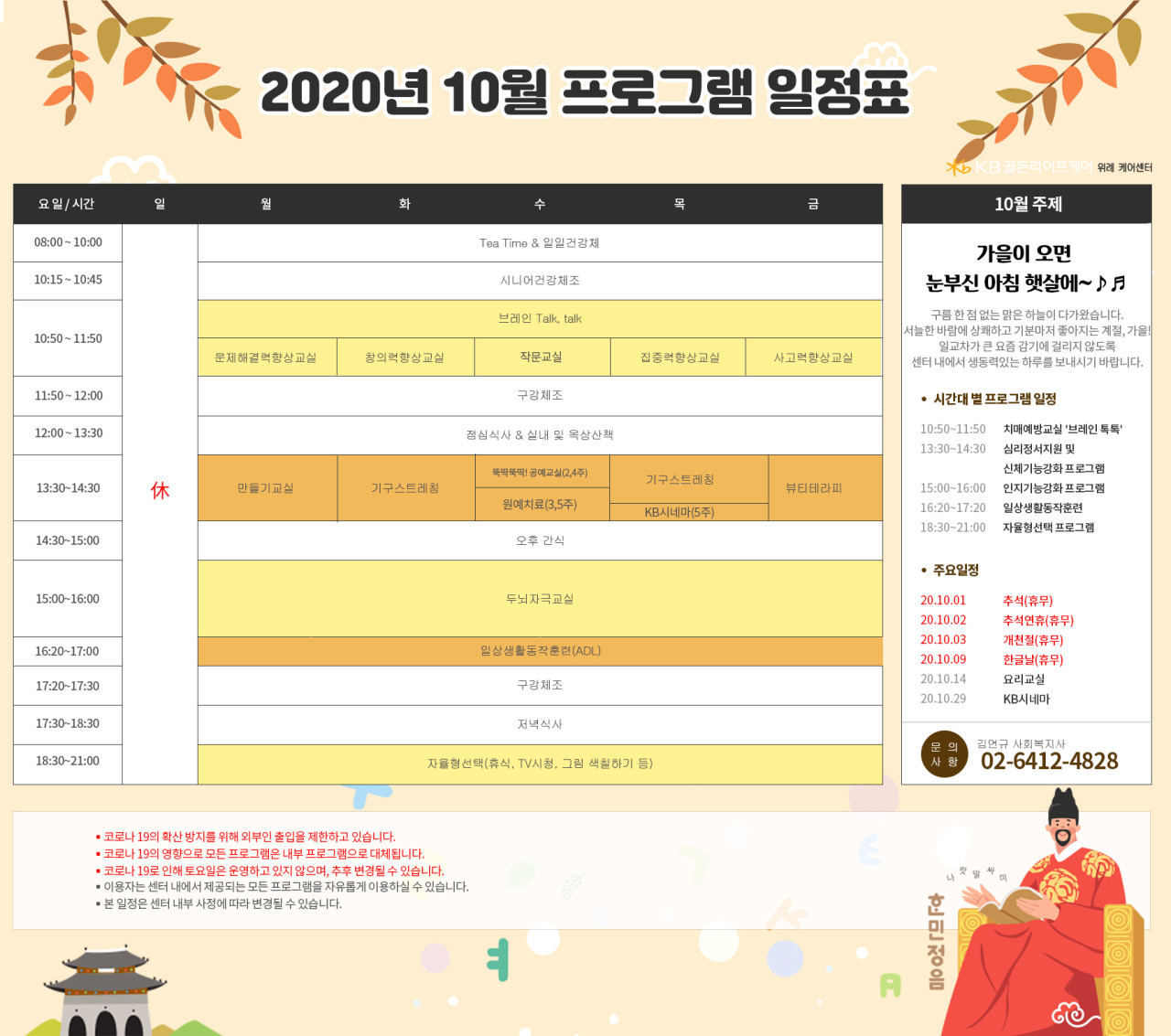 위례케어센터 [프로그램 안내] 2020년 위례 케어센터 10월 프로그램 일정표 페이지 정보 작성자 KB 골든라이프 댓글 0건 조회 4,276회 작성일 20-10-05 14:40 목록 본문 목록 이전글[프로그램 안내] 2020년 강동케어센터 10월 프로그램 20.10.05 다음글[식단안내] 위례 케어센터 10월 2주차 식단표 20.10.02