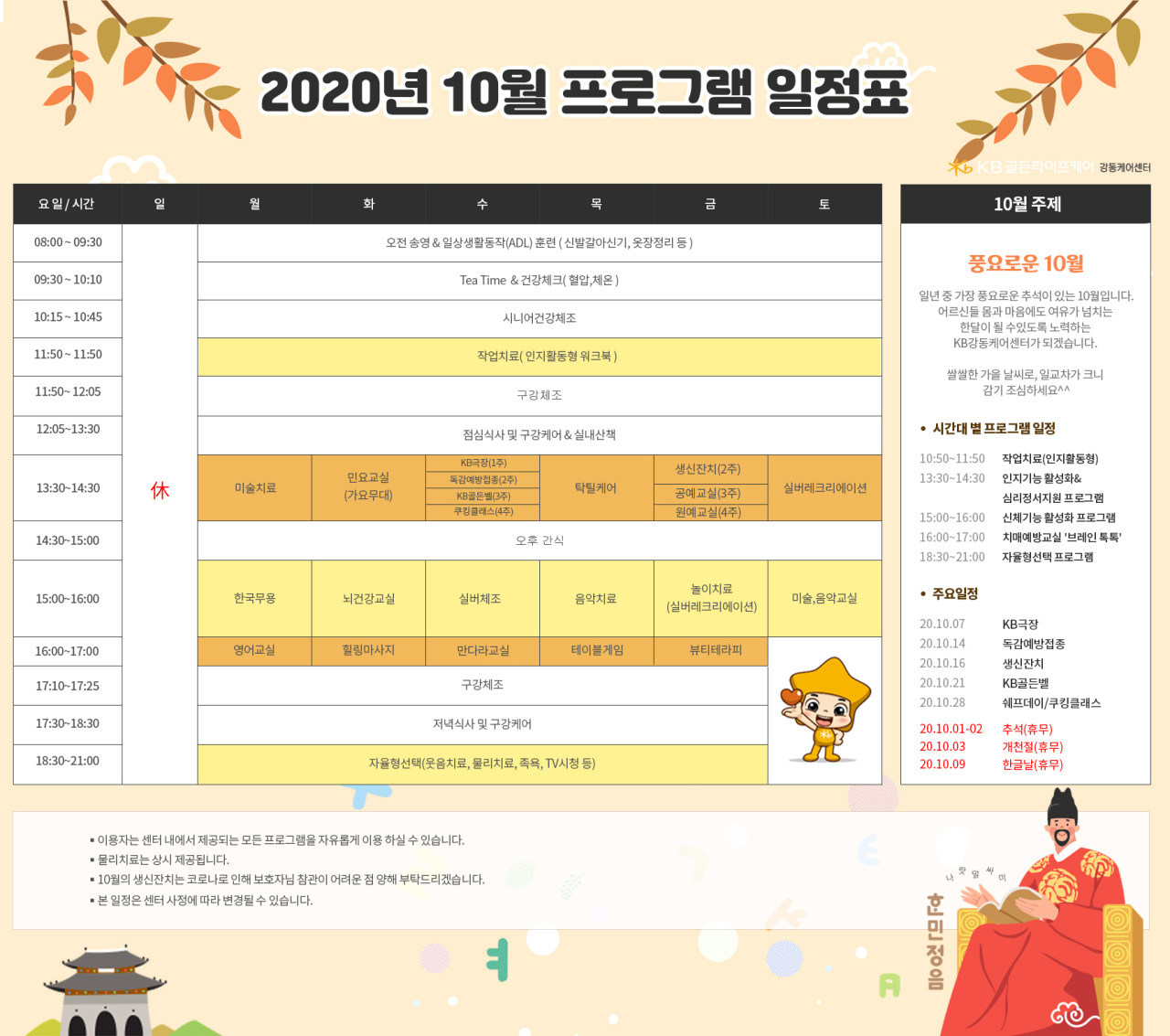 강동케어센터 [프로그램 안내] 2020년 강동케어센터 10월 프로그램 페이지 정보 작성자 KB 골든라이프 댓글 0건 조회 3,848회 작성일 20-10-05 15:25 목록 본문 목록 이전글[식단 안내] 2020년 강동케어센터 10월 식단표 20.10.05 다음글[프로그램 안내] 2020년 위례 케어센터 10월 프로그램 일정표 20.10.05
