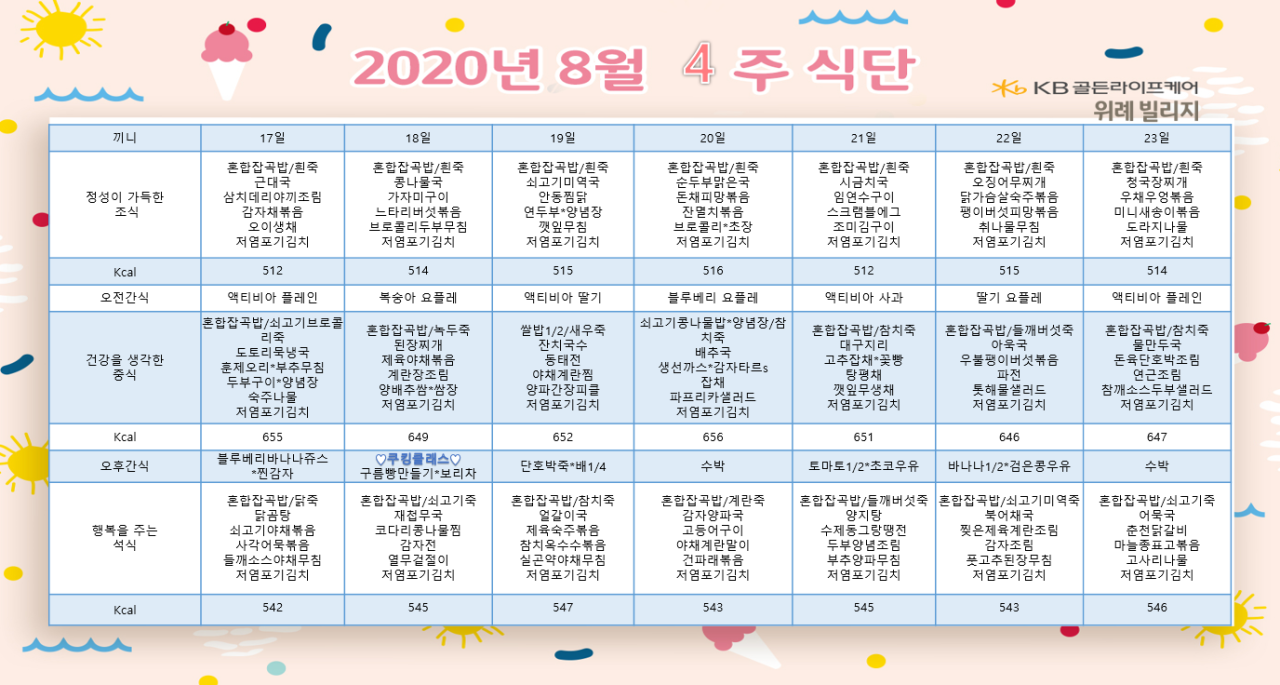 위례빌리지 [식단안내] 위례 빌리지 8월 4주차 식단표 페이지 정보 작성자 KB 골든라이프 댓글 0건 조회 3,889회 작성일 20-08-13 13:13 목록 본문 목록 이전글[식단안내] 위례 케어센터 8월 4주차 식단표 20.08.13 다음글[식단안내] 위례 케어센터 8월 3주차 식단표 20.08.06