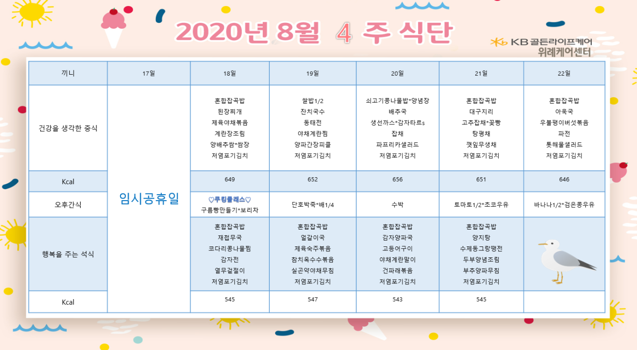 위례케어센터 [식단안내] 위례 케어센터 8월 4주차 식단표 페이지 정보 작성자 KB 골든라이프 댓글 0건 조회 3,868회 작성일 20-08-13 13:13 목록 본문 목록 이전글[식단안내] 위례 빌리지 8월 5주차 식단표 20.08.20 다음글[식단안내] 위례 빌리지 8월 4주차 식단표 20.08.13