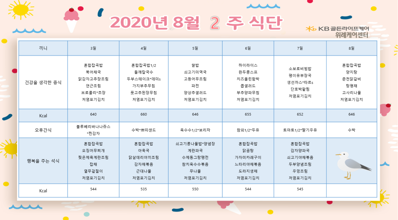 위례케어센터 [식단안내] 위례 케어센터 8월 2주차 식단표 페이지 정보 작성자 KB 골든라이프 댓글 0건 조회 4,097회 작성일 20-07-31 09:44 목록 본문 목록 이전글[프로그램 안내] 2020년 강동케어센터 8월 프로그램 20.08.01 다음글[식단안내] 위례 빌리지 8월 2주차 식단표 20.07.31