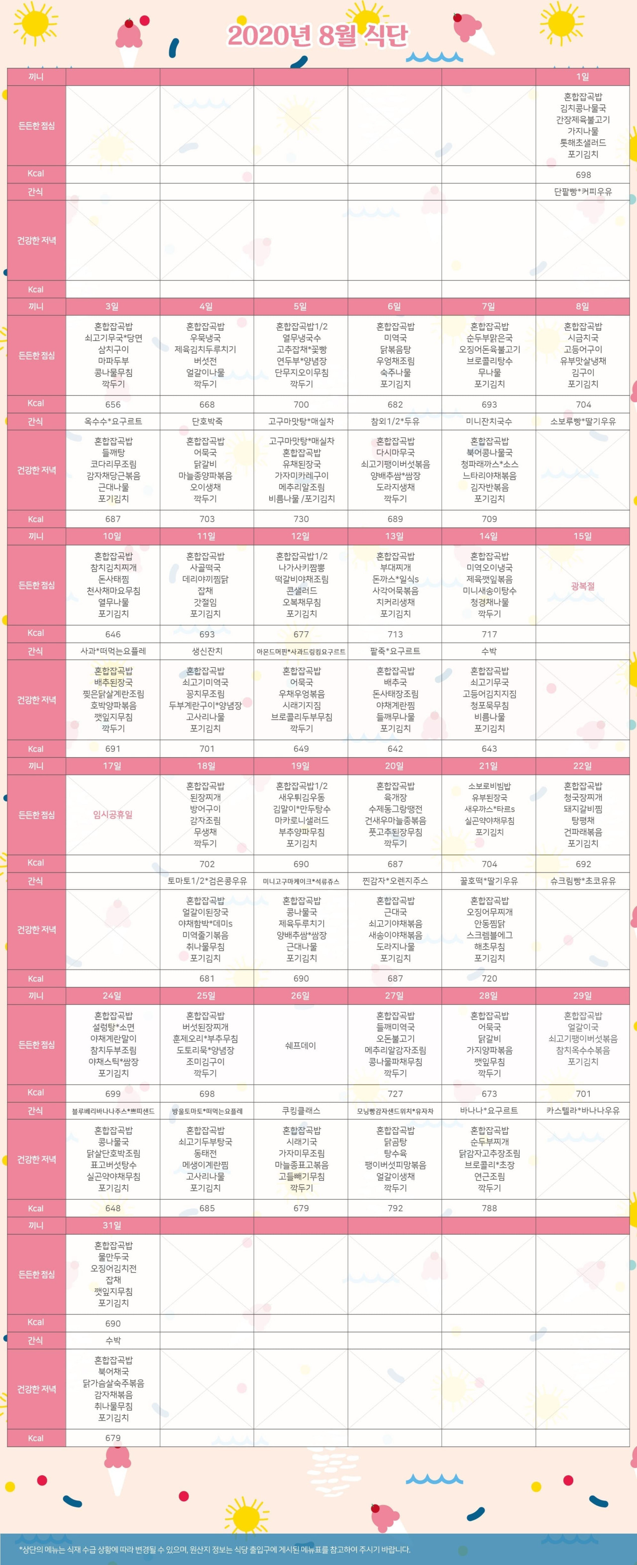강동케어센터 [식단 안내] 2020년 강동케어센터 8월 식단표 페이지 정보 작성자 KB 골든라이프 댓글 0건 조회 4,344회 작성일 20-08-01 13:31 목록 본문 목록 이전글[프로그램 안내] 2020년 위례 케어센터 8월 프로그램 일정표 20.08.03 다음글[프로그램 안내] 2020년 강동케어센터 8월 프로그램 20.08.01