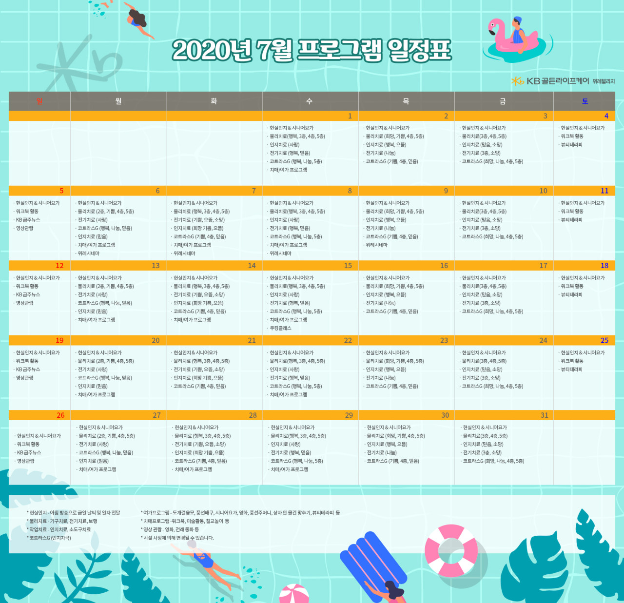 위례빌리지 [프로그램 안내] 2020년 위례 빌리지 7월 프로그램 일정표 페이지 정보 작성자 KB 골든라이프 댓글 0건 조회 5,884회 작성일 20-07-08 13:21 목록 본문 목록 이전글[식단안내] 위례 빌리지 7월 3주차 식단표 20.07.10 다음글[식단안내] 위례 케어센터 7월 2주차 식단표 20.07.02