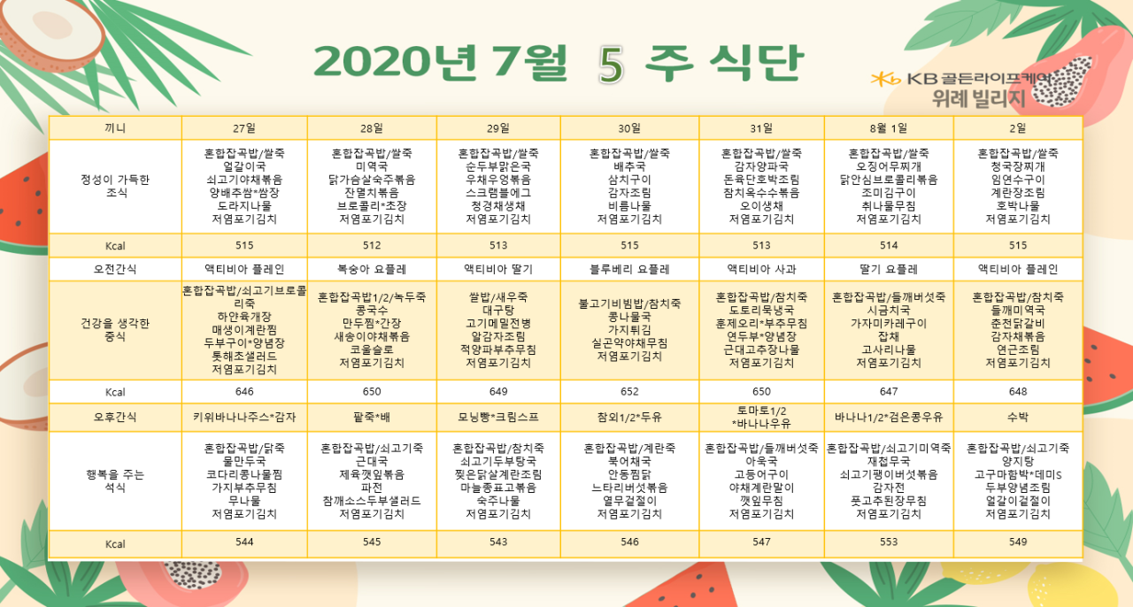 위례빌리지 [식단안내] 위례 빌리지 7월 5주차 식단표 페이지 정보 작성자 KB 골든라이프 댓글 0건 조회 4,129회 작성일 20-07-27 09:54 목록 본문 목록 이전글[식단안내] 위례 케어센터 7월 5주차 식단표 20.07.27 다음글[식단안내] 위례 케어센터 7월 4주차 식단표 20.07.16