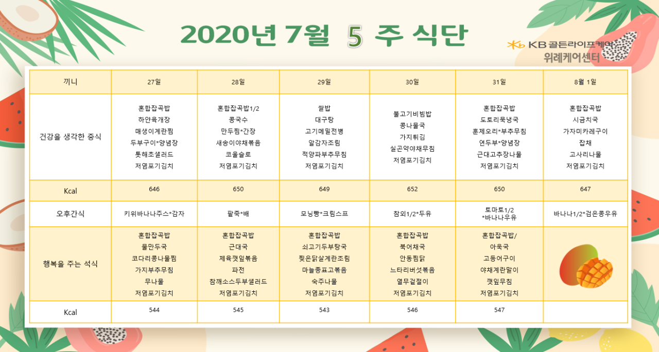 위례케어센터 [식단안내] 위례 케어센터 7월 5주차 식단표 페이지 정보 작성자 KB 골든라이프 댓글 0건 조회 3,970회 작성일 20-07-27 09:58 목록 본문 목록 이전글[식단안내] 위례 빌리지 8월 2주차 식단표 20.07.31 다음글[식단안내] 위례 빌리지 7월 5주차 식단표 20.07.27