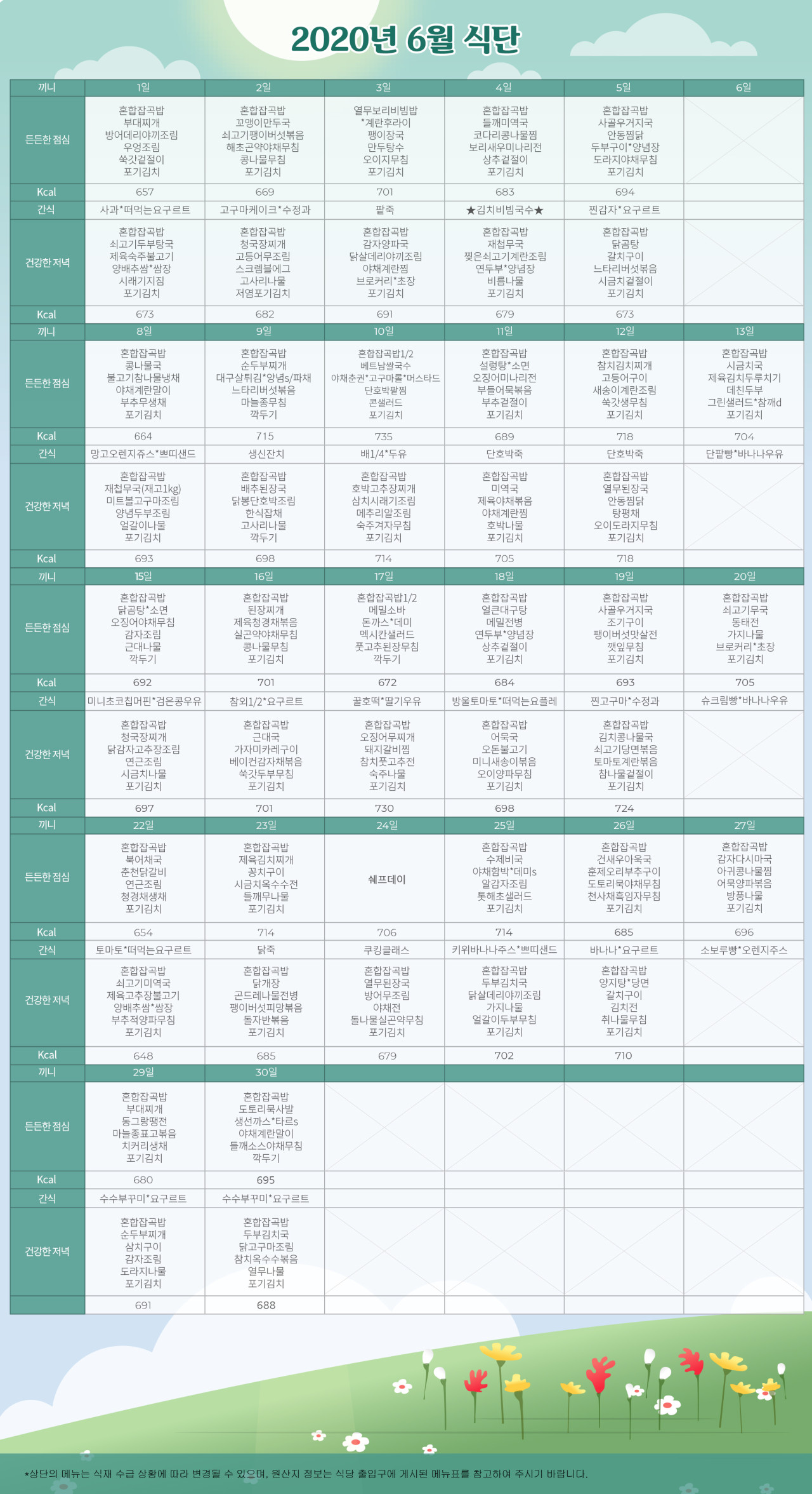 강동케어센터 [식단 안내] 2020년 강동케어센터 6월 식단표 페이지 정보 작성자 KB 골든라이프 댓글 0건 조회 4,005회 작성일 20-05-28 11:48 목록 본문 목록 이전글[식단안내] 위례 빌리지 6월 1주차 식단표 20.05.29 다음글[프로그램 안내] 2020년 강동케어센터 6월 프로그램 일정표 20.05.28