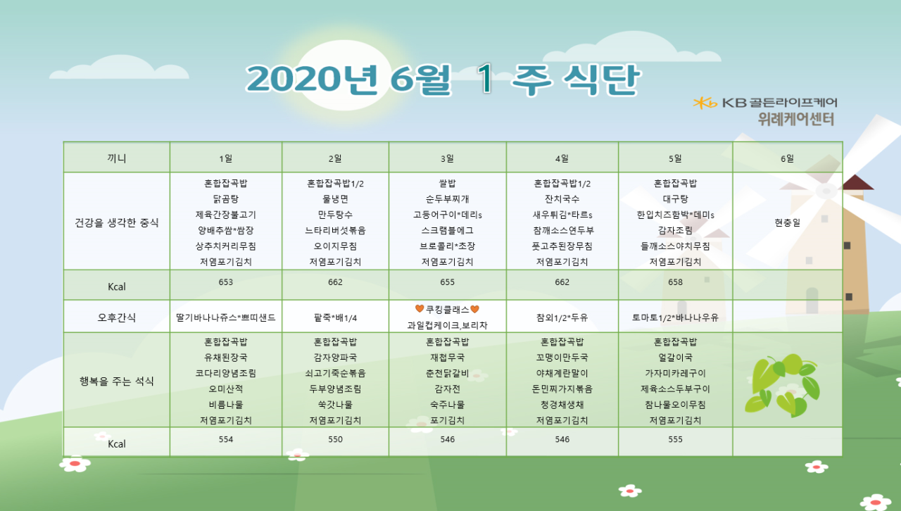 위례케어센터 [식단안내] 위례 케어센터 6월 1주차 식단표 페이지 정보 작성자 KB 골든라이프 댓글 0건 조회 4,024회 작성일 20-05-29 10:25 목록 본문 목록 이전글[프로그램 안내] 2020년 위례 빌리지 06월 프로그램 일정표 20.06.01 다음글[식단안내] 위례 빌리지 6월 1주차 식단표 20.05.29