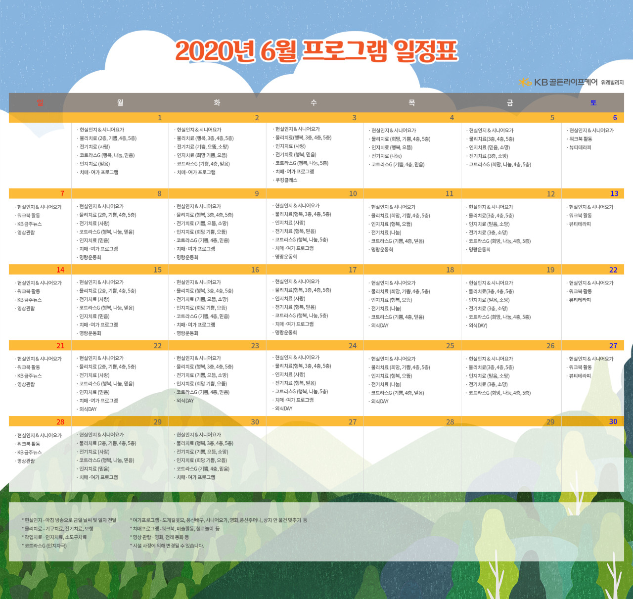 위례빌리지 [프로그램 안내] 2020년 위례 빌리지 06월 프로그램 일정표 페이지 정보 작성자 KB 골든라이프 댓글 0건 조회 4,371회 작성일 20-06-01 10:26 목록 본문 목록 이전글[식단안내] 위례 빌리지 6월 2주차 식단표 20.06.05 다음글[식단안내] 위례 케어센터 6월 1주차 식단표 20.05.29