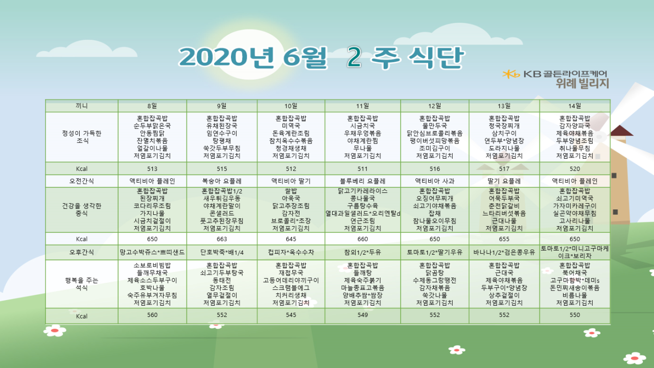 위례빌리지 [식단안내] 위례 빌리지 6월 2주차 식단표 페이지 정보 작성자 KB 골든라이프 댓글 0건 조회 4,111회 작성일 20-06-05 13:51 목록 본문 목록 이전글[식단안내] 위례 케어센터 6월 2주차 식단표 20.06.05 다음글[프로그램 안내] 2020년 위례 빌리지 06월 프로그램 일정표 20.06.01
