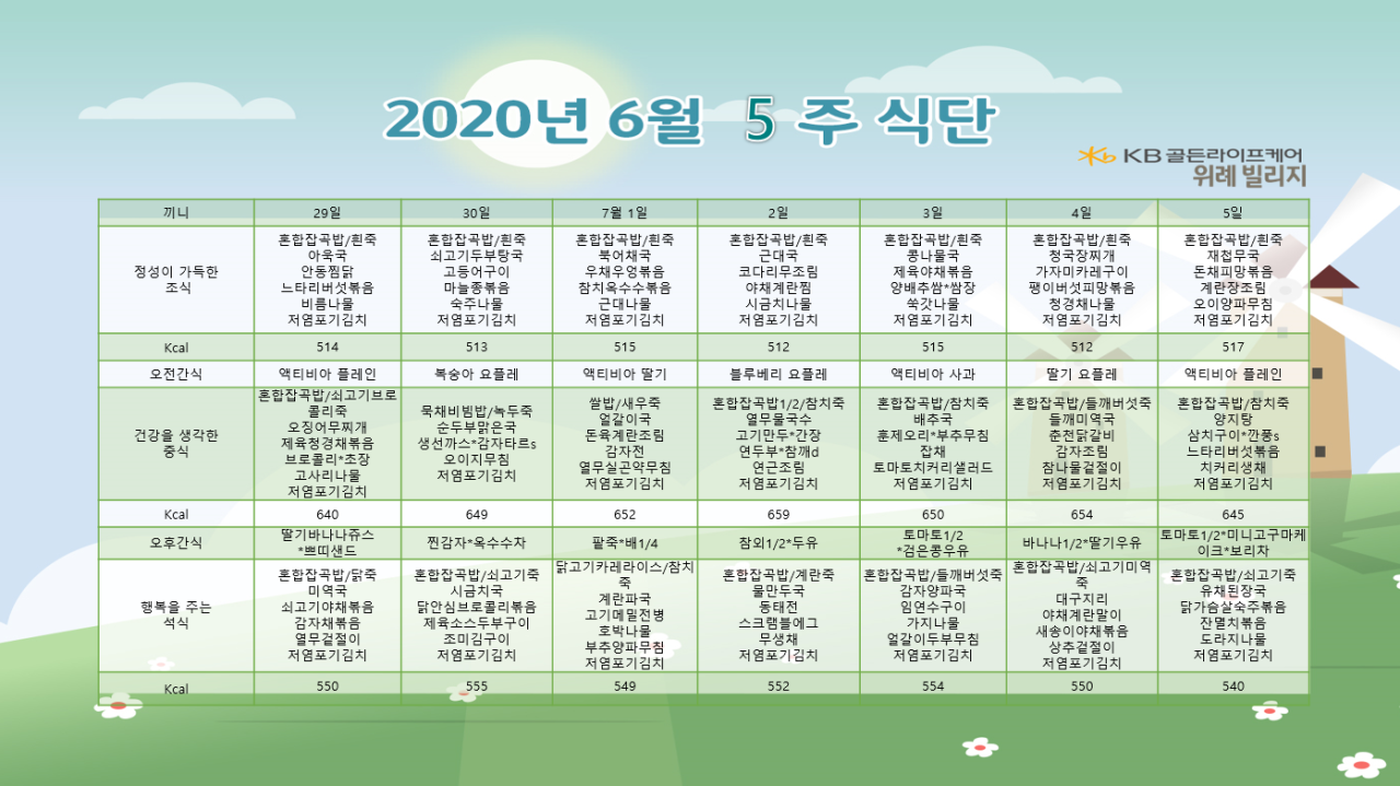 위례빌리지 [식단안내] 위례빌리지 6월 5주차 식단표 페이지 정보 작성자 KB 골든라이프 댓글 0건 조회 4,077회 작성일 20-06-25 17:32 목록 본문 목록 이전글[식단안내] 위례 케어센터 6월 5주차 식단표 20.06.25 다음글[식단안내] 위례 케어센터 6월 4주차 식단표 20.06.19