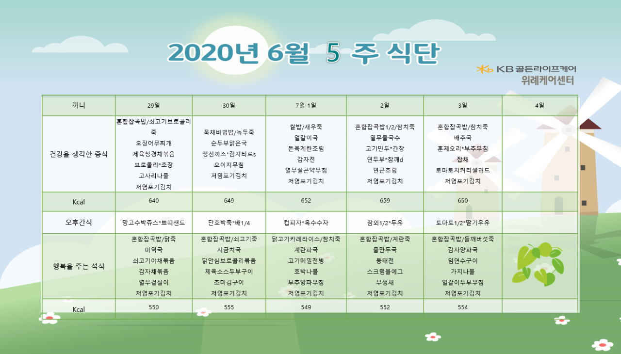 위례케어센터 [식단안내] 위례 케어센터 6월 5주차 식단표 페이지 정보 작성자 KB 골든라이프 댓글 0건 조회 4,060회 작성일 20-06-25 17:36 목록 본문 목록 이전글[프로그램 안내] 2020년 위례 케어센터 7월 프로그램 일정표 20.07.01 다음글[식단안내] 위례빌리지 6월 5주차 식단표 20.06.25