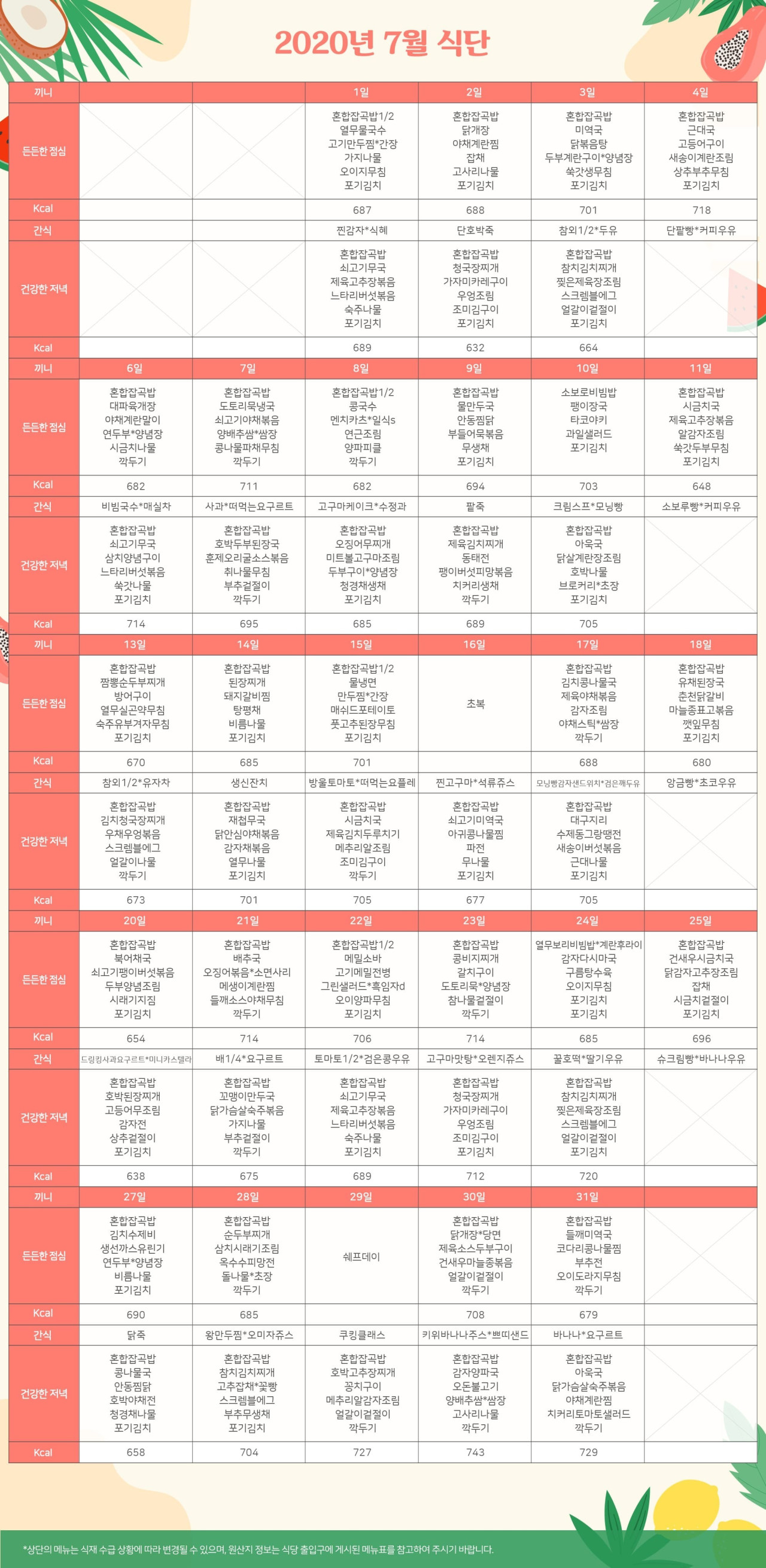 강동케어센터 [식단 안내] 2020년 강동케어센터 7월 식단표 페이지 정보 작성자 KB 골든라이프 댓글 0건 조회 5,929회 작성일 20-07-01 13:34 목록 본문 목록 이전글[식단안내] 위례 빌리지 7월 2주차 식단표 20.07.02 다음글[프로그램 안내] 2020년 강동케어센터 7월 프로그램 20.07.01