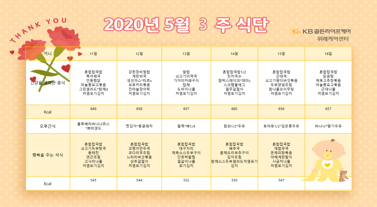 위례케어센터 [식단안내] 위례 케어센터 5월 3주차 식단표 페이지 정보 작성자 KB 골든라이프 댓글 0건 조회 4,257회 작성일 20-05-08 10:37 목록 본문 목록 이전글[프로그램 안내] 2020년 강동케어센터 5월 프로그램 20.05.08 다음글[식단안내] 위례 빌리지 5월 3주차 식단표 20.05.08