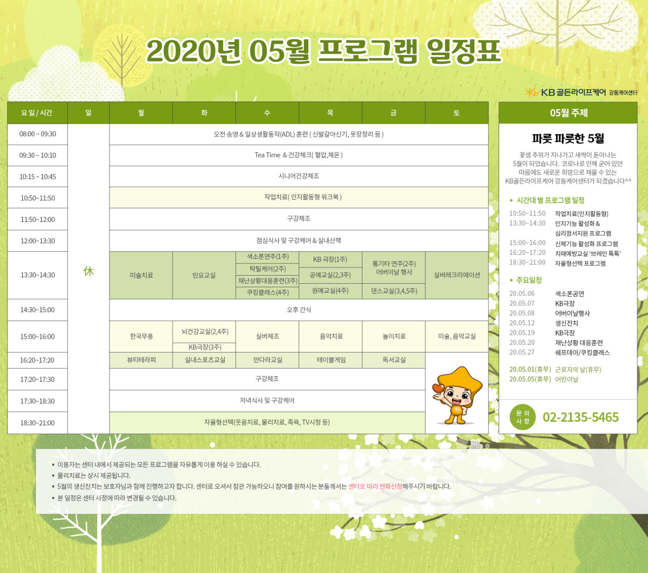 강동케어센터 [프로그램 안내] 2020년 강동케어센터 5월 프로그램 페이지 정보 작성자 KB 골든라이프 댓글 0건 조회 4,239회 작성일 20-05-08 15:45 목록 본문 목록 이전글[프로그램 안내] 2020년 위례 케어센터 5월 프로그램 일정표 20.05.11 다음글[식단안내] 위례 케어센터 5월 3주차 식단표 20.05.08