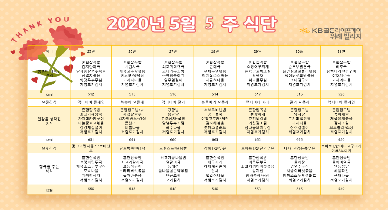 위례빌리지 [식단안내] 위례 빌리지 5월 5주차 식단표 페이지 정보 작성자 KB 골든라이프 댓글 0건 조회 4,072회 작성일 20-05-22 11:31 목록 본문 목록 이전글[식단안내] 위례 케어센터 5월 5주차 식단표 20.05.22 다음글[식단안내] 위례 케어센터 5월 4주차 식단표 20.05.14