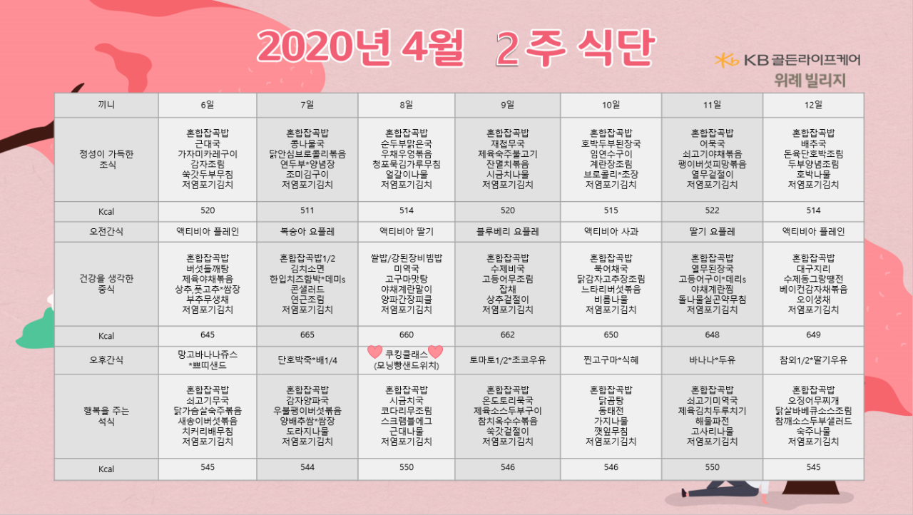 위례빌리지 [식단안내] 위례 빌리지 4월 2주차 식단표 페이지 정보 작성자 KB 골든라이프 댓글 0건 조회 3,679회 작성일 20-04-06 16:25 목록 본문 목록 이전글[식단안내] 위례 케어센터 4월 2주차 식단표 20.04.06 다음글[식단안내] 위례 케어센터 3월 5주차 식단표 20.03.27
