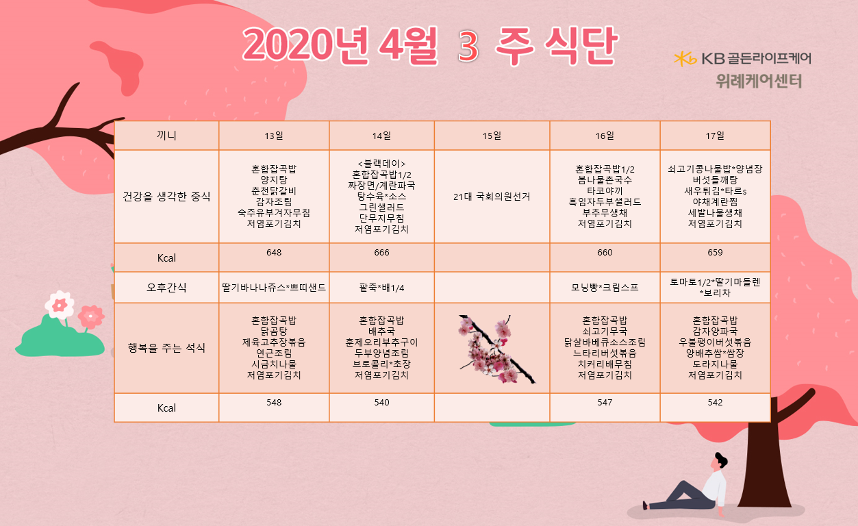 위례케어센터 [식단안내] 위례 케어센터 4월 3주차 식단표 페이지 정보 작성자 KB 골든라이프 댓글 0건 조회 3,946회 작성일 20-04-14 09:40 목록 본문 목록 이전글[식단안내] 위례 빌리지 4월 4주차 식단표 20.04.17 다음글[식단안내] 위례 빌리지 4월 3주차 식단표 20.04.14