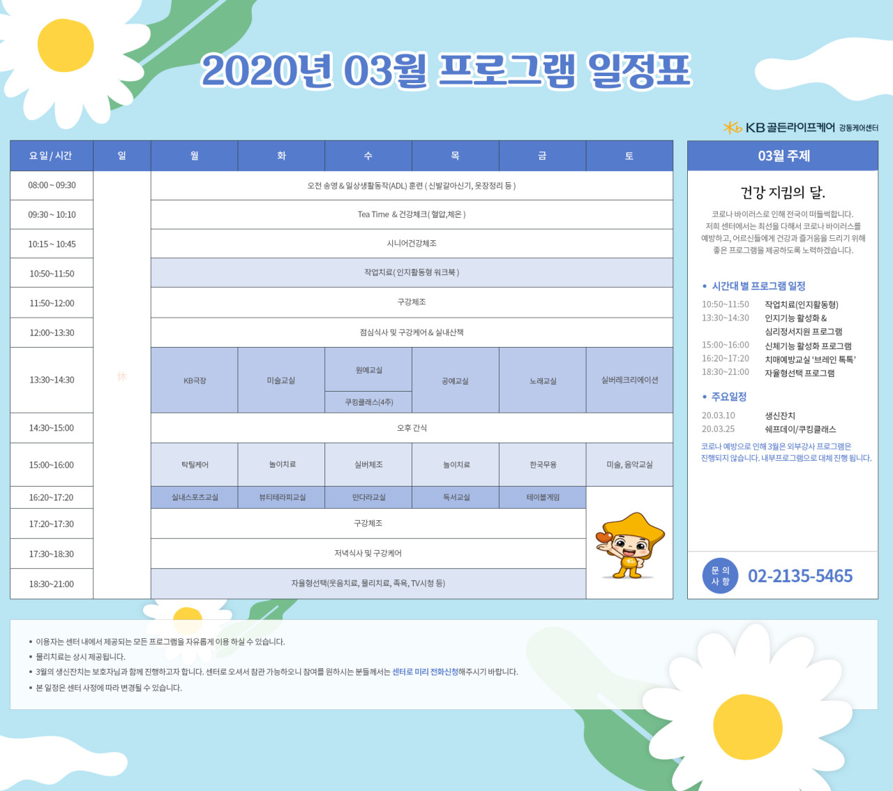 강동케어센터 [프로그램 안내] 2020년 강동케어센터 3월 프로그램 일정표 페이지 정보 작성자 KB 골든라이프 댓글 0건 조회 3,860회 작성일 20-03-03 12:23 목록 본문 목록 이전글[식단안내] 강동케어센터 2020년 3월 식단표 20.03.03 다음글[프로그램 안내] 2020년 위례 빌리지 03월 프로그램 일정표 20.03.03