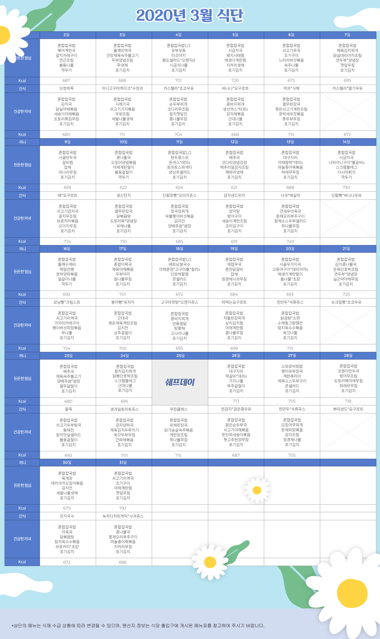강동케어센터 [식단안내] 강동케어센터 2020년 3월 식단표 페이지 정보 작성자 KB 골든라이프 댓글 0건 조회 4,158회 작성일 20-03-03 12:24 목록 본문 목록 이전글[프로그램 안내] 2020년 위례케어센터 03월 프로그램 일정표 20.03.03 다음글[프로그램 안내] 2020년 강동케어센터 3월 프로그램 일정표 20.03.03