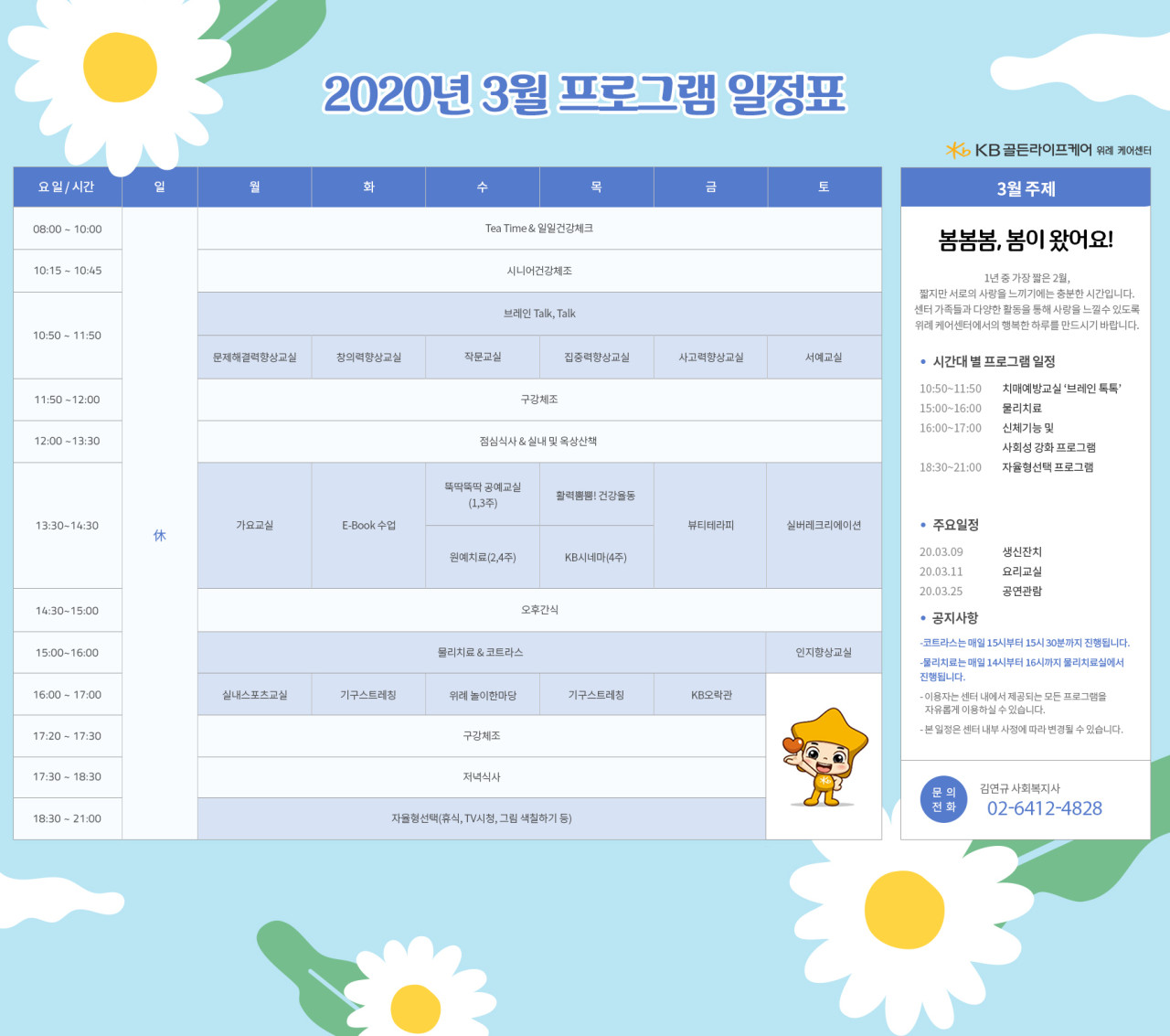 위례케어센터 [프로그램 안내] 2020년 위례케어센터 03월 프로그램 일정표 페이지 정보 작성자 KB 골든라이프 댓글 0건 조회 4,111회 작성일 20-03-03 17:56 목록 본문 목록 이전글[식단안내] 위례빌리지 3월 2주차 식단표 20.03.06 다음글[식단안내] 강동케어센터 2020년 3월 식단표 20.03.03