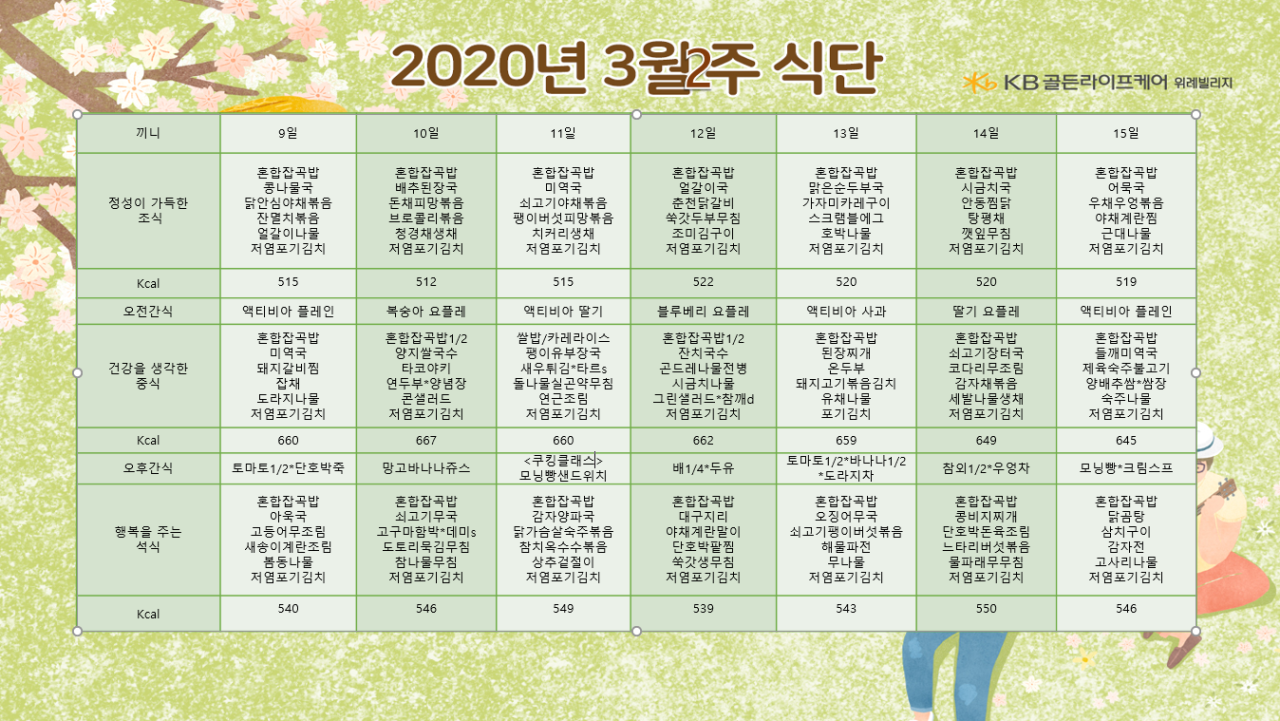 위례빌리지 [식단안내] 위례빌리지 3월 2주차 식단표 페이지 정보 작성자 KB 골든라이프 댓글 0건 조회 4,037회 작성일 20-03-06 10:07 목록 본문 목록 이전글[식단안내] 위례 케어센터 3월 2주차 식단표 20.03.06 다음글[프로그램 안내] 2020년 위례케어센터 03월 프로그램 일정표 20.03.03