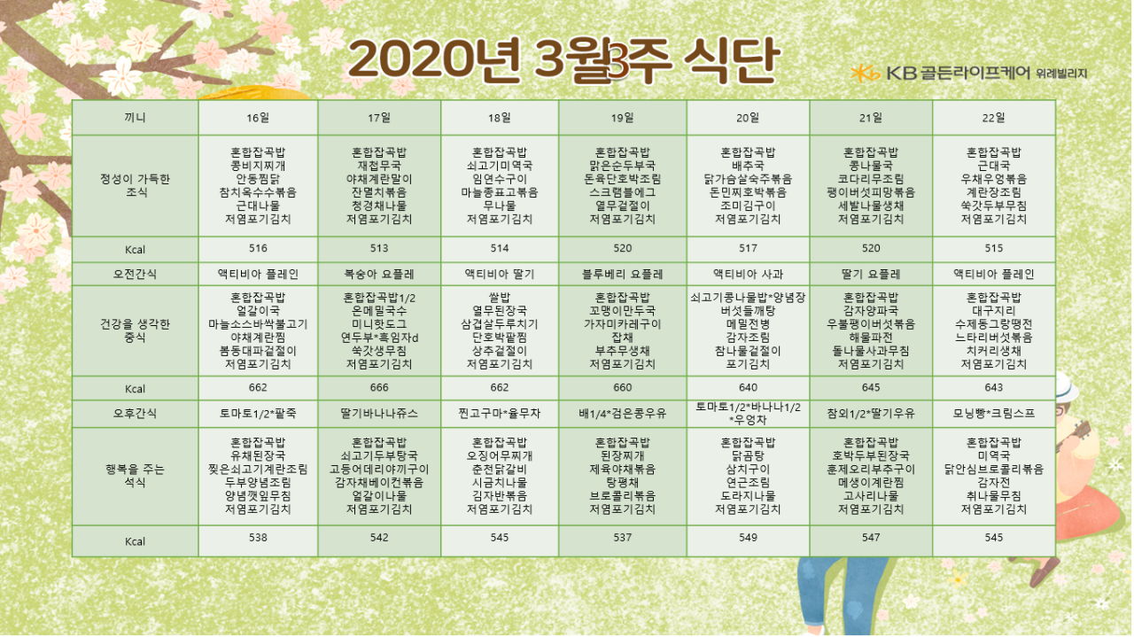 위례빌리지 [식단안내] 위례 빌리지 3월 3주차 식단표 페이지 정보 작성자 KB 골든라이프 댓글 0건 조회 3,912회 작성일 20-03-13 10:37 목록 본문 목록 이전글[식단안내] 위례케어센터 3월 3주차 식단표 20.03.13 다음글[식단안내] 위례 케어센터 3월 2주차 식단표 20.03.06