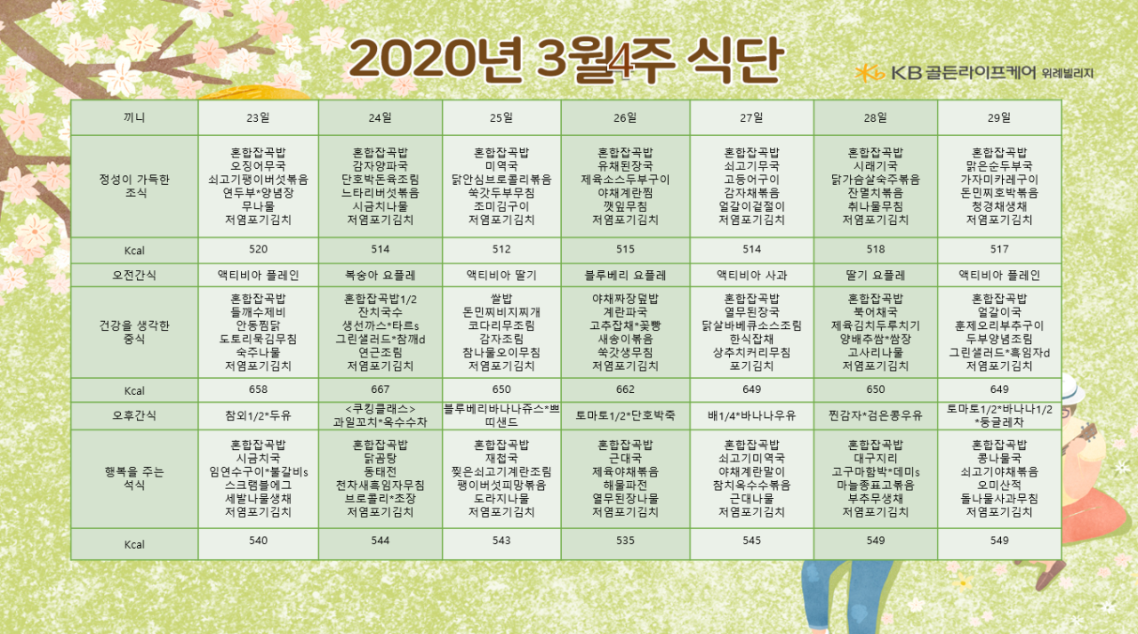 위례빌리지 [식단안내] 위례 빌리지 3월 4주차 식단표 페이지 정보 작성자 KB 골든라이프 댓글 0건 조회 4,224회 작성일 20-03-20 10:05 목록 본문 목록 이전글[식단안내] 위례 케어센터 3월 4주차 식단표 20.03.20 다음글[식단안내] 위례케어센터 3월 3주차 식단표 20.03.13