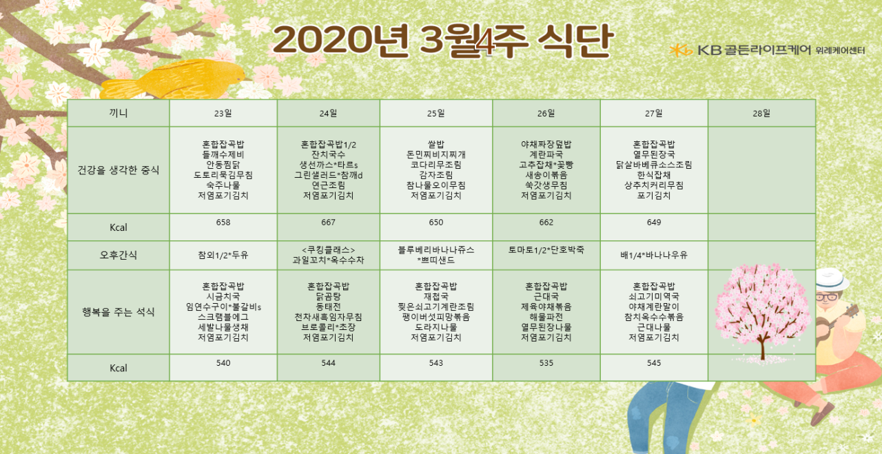위례케어센터 [식단안내] 위례 케어센터 3월 4주차 식단표 페이지 정보 작성자 KB 골든라이프 댓글 0건 조회 4,179회 작성일 20-03-20 10:06 목록 본문 목록 이전글[식단안내] 위례 빌리지 3월 5주차 식단표 20.03.27 다음글[식단안내] 위례 빌리지 3월 4주차 식단표 20.03.20