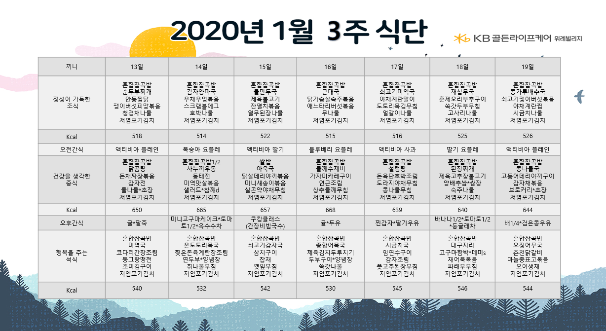위례빌리지 [식단안내] 위례 빌리지 1월 3주차 식단표 페이지 정보 작성자 KB 골든라이프 댓글 0건 조회 3,932회 작성일 20-01-10 09:53 목록 본문 목록 이전글[식단안내] 위례 케어센터 1월 3주차 식단표 20.01.10 다음글[식단안내] 강동케어센터 2020년 1월 식단표 20.01.07