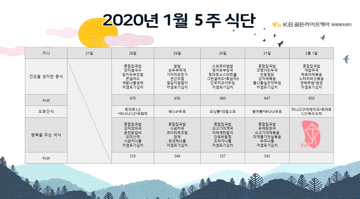 위례케어센터 [식단안내] 위례 케어센터 1월 5주차 식단표 페이지 정보 작성자 KB 골든라이프 댓글 0건 조회 3,992회 작성일 20-01-23 10:24 목록 본문 목록 이전글[식단안내] 위례빌리지 2월 2주차 식단표 20.01.31 다음글[식단안내] 위례 빌리지 1월 5주차 식단표 20.01.23