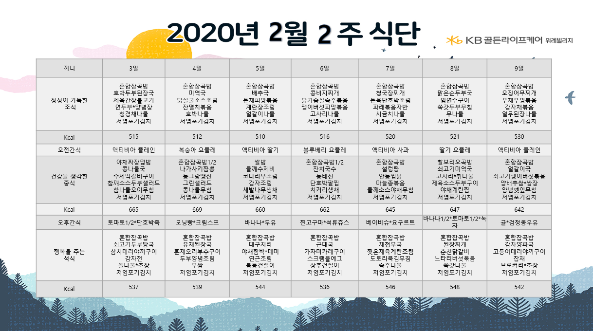 위례빌리지 [식단안내] 위례빌리지 2월 2주차 식단표 페이지 정보 작성자 KB 골든라이프 댓글 0건 조회 3,673회 작성일 20-01-31 17:40 목록 본문 목록 이전글[식단안내] 위례 케어센터 2월 2주차 식단표 20.01.31 다음글[식단안내] 위례 케어센터 1월 5주차 식단표 20.01.23