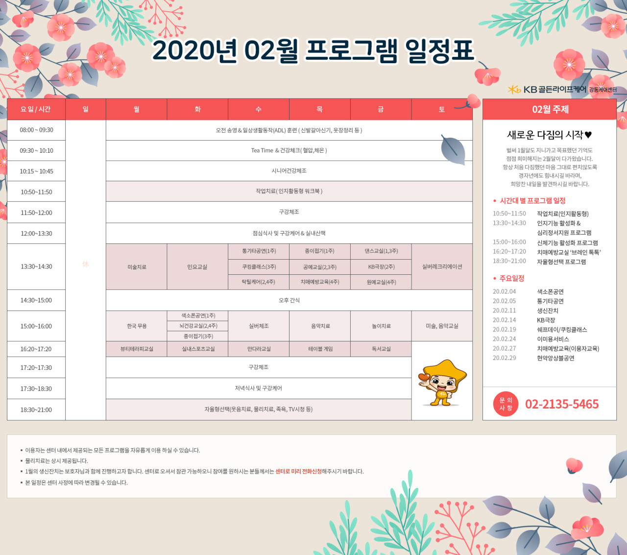 강동케어센터 [프로그램 안내] 2020년 강동케어센터 2월 프로그램 일정표 페이지 정보 작성자 KB 골든라이프 댓글 0건 조회 4,094회 작성일 20-02-04 18:10 목록 본문 목록 이전글[식단안내] 위례빌리지 2월 3주차 식단표 20.02.06 다음글[식단안내] 강동케어센터 2020년 2월 식단표 20.02.04