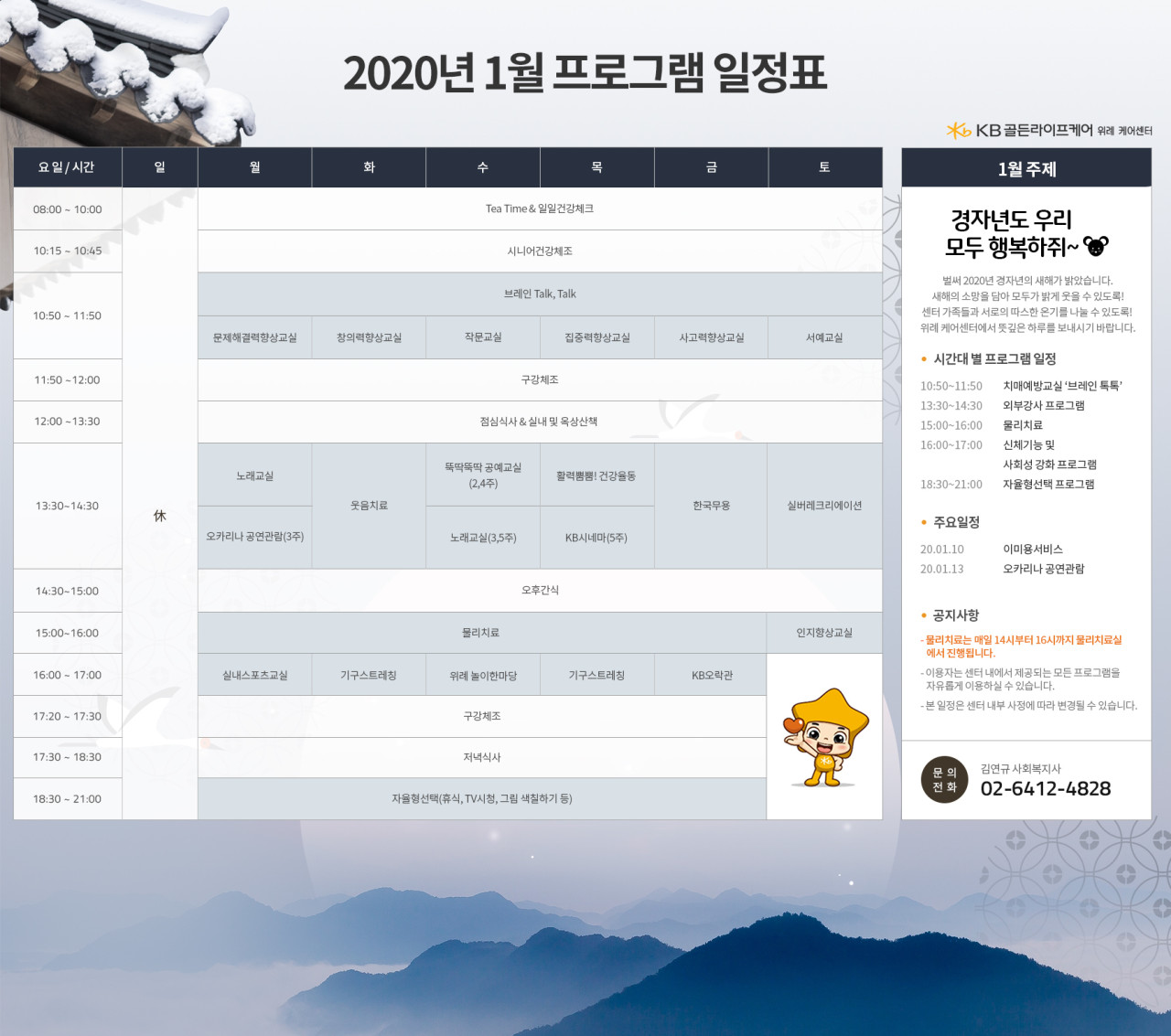 위례케어센터 [프로그램 안내] 2020년 위례케어센터 01월 프로그램 일정표 페이지 정보 작성자 KB 골든라이프 댓글 0건 조회 4,052회 작성일 20-01-06 09:51 목록 본문 목록 이전글[프로그램 안내] 2020년 강동케어센터 1월 프로그램 일정표 20.01.07 다음글[식단안내] 위례 케어센터 1월 2주차 식단표 20.01.03