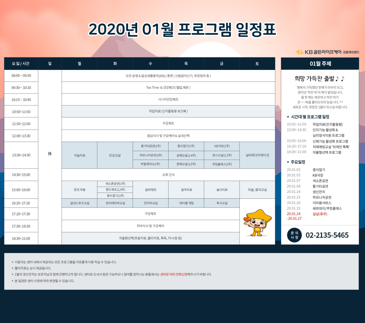 강동케어센터 [프로그램 안내] 2020년 강동케어센터 1월 프로그램 일정표 페이지 정보 작성자 KB 골든라이프 댓글 0건 조회 4,259회 작성일 20-01-07 14:30 목록 본문 목록 이전글[식단안내] 강동케어센터 2020년 1월 식단표 20.01.07 다음글[프로그램 안내] 2020년 위례케어센터 01월 프로그램 일정표 20.01.06