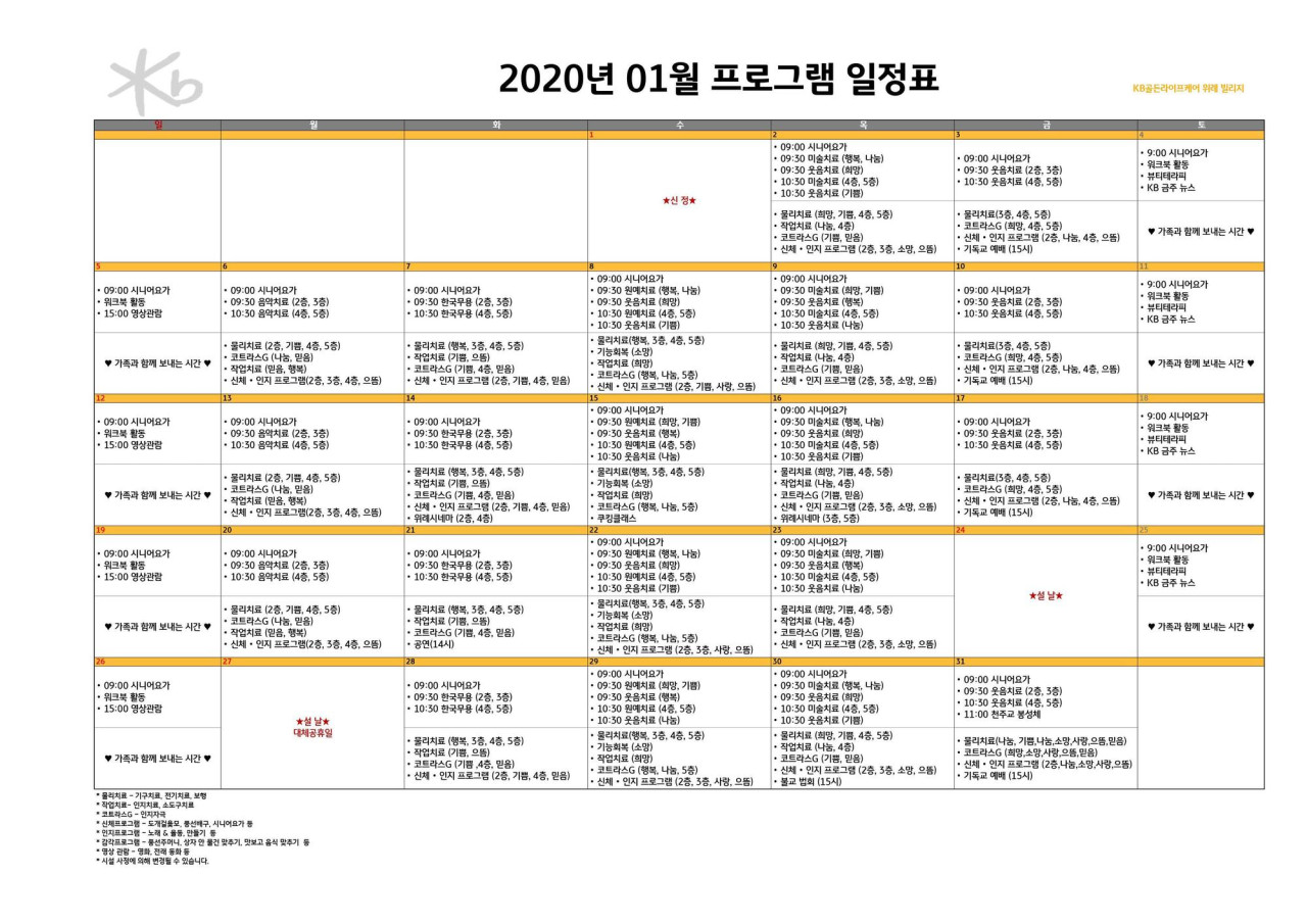 위례빌리지 [프로그램 안내] 2020년 위례 빌리지 01월 프로그램 일정표 페이지 정보 작성자 KB 골든라이프 댓글 0건 조회 3,834회 작성일 20-01-02 14:07 목록 본문 목록 이전글[프로그램 안내] 2020년 위례 빌리지 01월 프로그램 일정표 20.01.02 다음글[식단안내] 위례 케어센터 12월 5주차 식단표 19.12.26