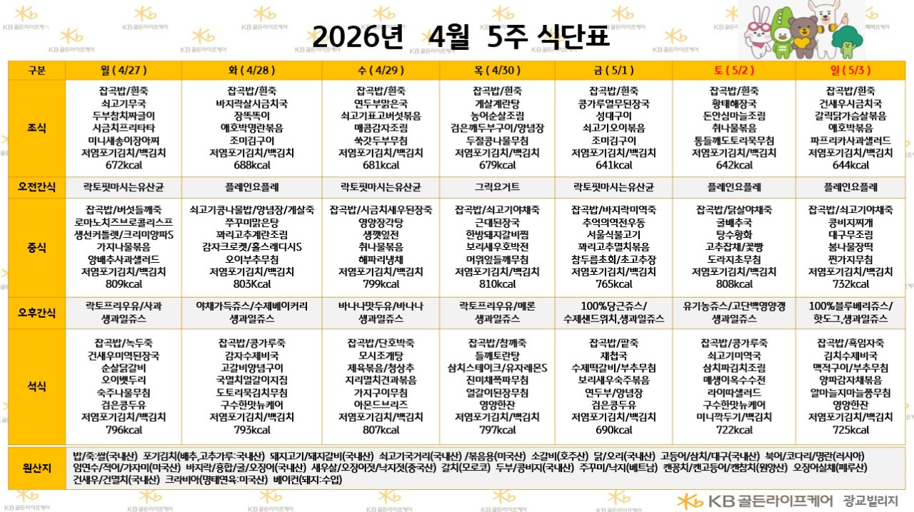 광교빌리지 [식단안내] 2026년 4월 5주차 식단표 페이지 정보 작성자 최고관리자 댓글 0건 조회 9회 작성일 26-04-24 19:01 목록 본문 목록 이전글[하루의 식단] 2026년 4월 22일 하루식단 26.04.24 다음글[하루의 식단] 2026년 4월 22일 26.04.24