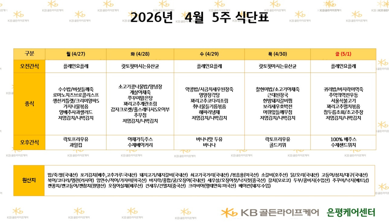 은평케어센터 [식단안내] 2026년 4월 5주차 식단표 페이지 정보 작성자 최고관리자 댓글 0건 조회 7회 작성일 26-04-25 10:12 목록 본문 목록 이전글[오늘의식단] 2026년 4월 23일 조/중/석식 26.04.25 다음글[오늘의식단] 2026년 4월 21일 중식 26.04.25