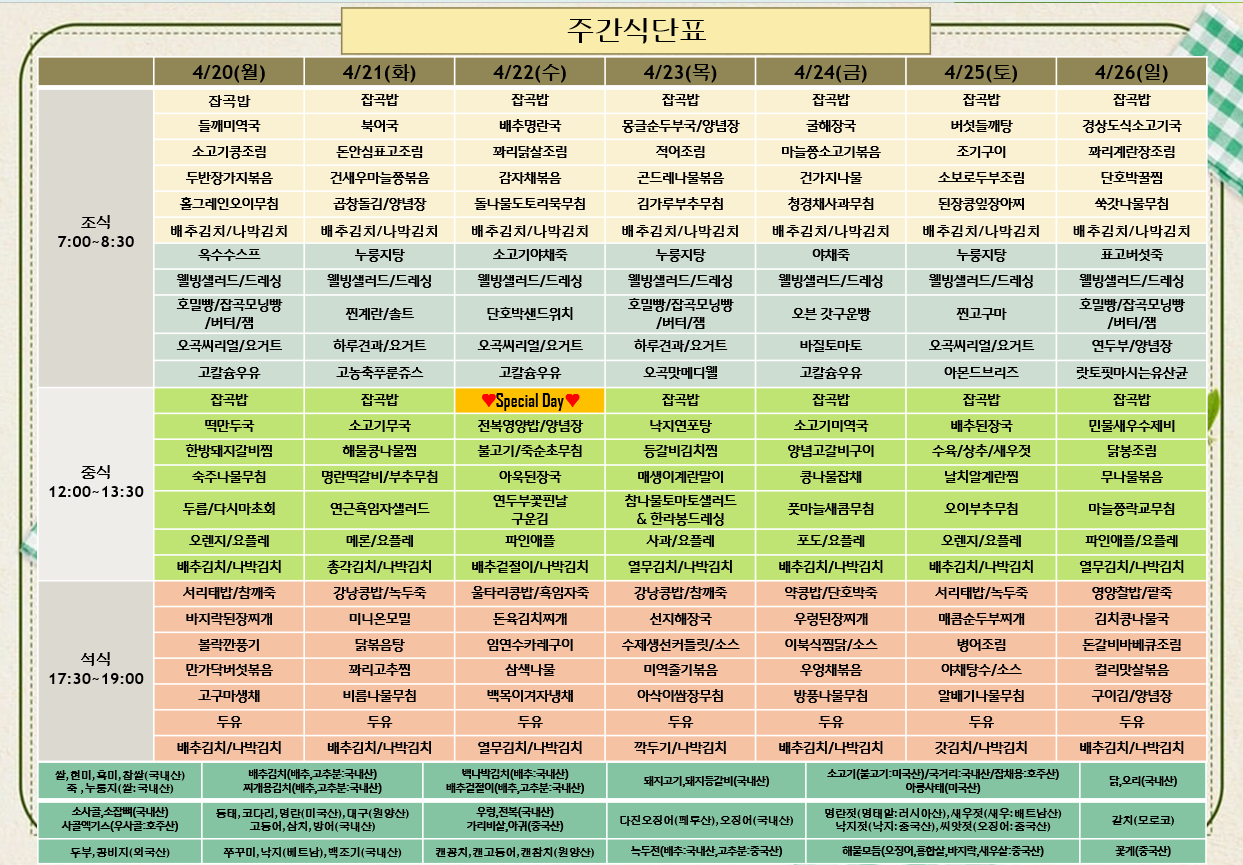 평창카운티 [식단안내] 2026년 4월 4주차 식단표 페이지 정보 작성자 최고관리자 댓글 0건 조회 9회 작성일 26-04-20 06:30 목록 본문 목록 다음글[식단안내] 2026년 4월 4주차 식단표 26.04.18