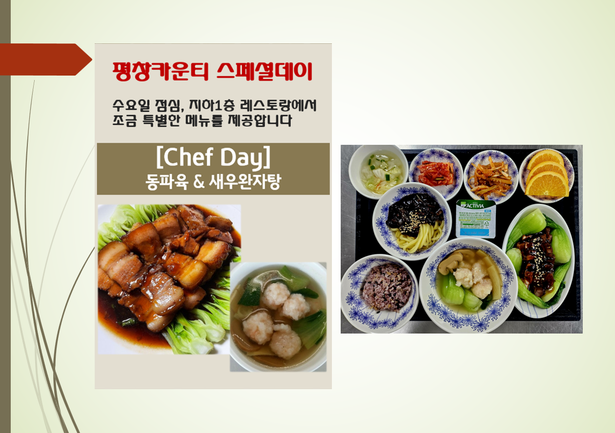 평창카운티 2025.11.19 Chef Day 페이지 정보 작성자 최고관리자 댓글 0건 조회 1,040회 작성일 25-11-20 09:10 목록 본문 목록 이전글[식단안내] 2025년 11월 4주차 식단표 25.11.20 다음글[식단안내] 2025년 11월 3주차 주간식단표 25.11.17