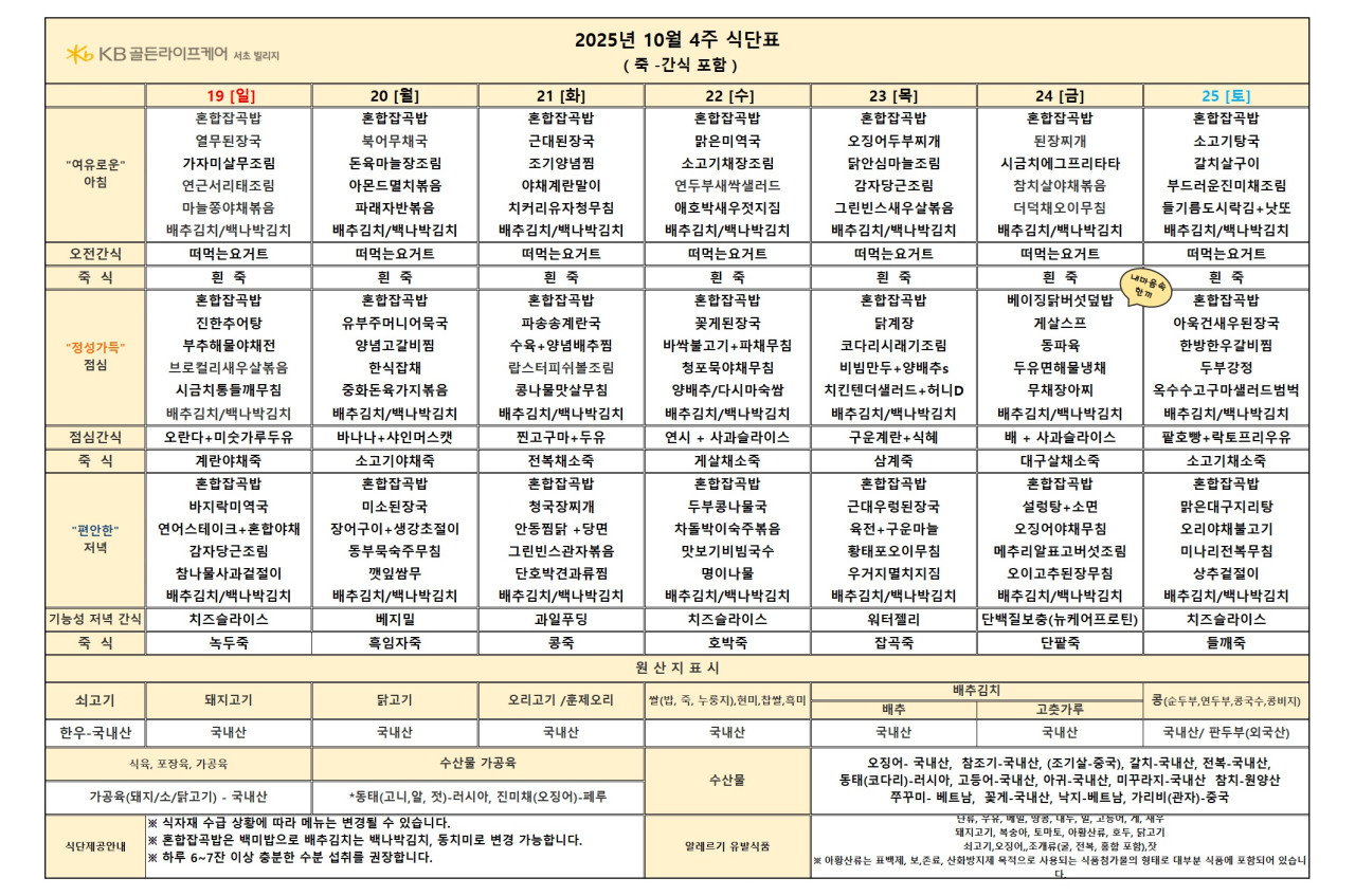 서초빌리지 서초빌리지 2025년 10월 4주차 식단안내