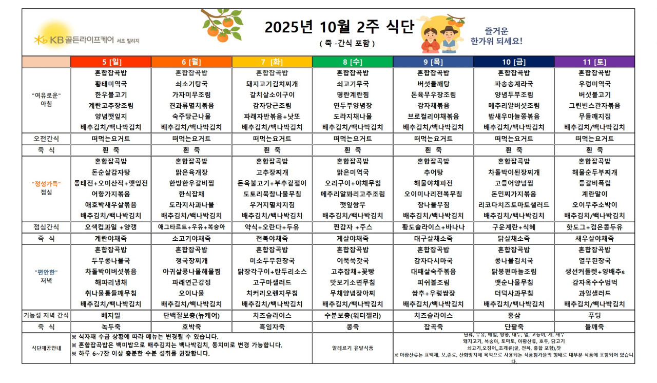 서초빌리지 서초빌리지 2025년 10월 2주차 식단표