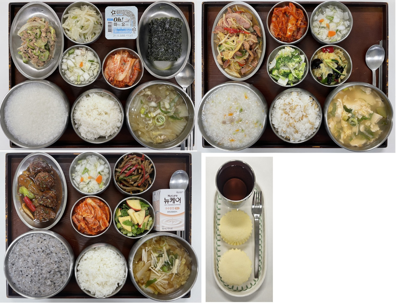 은평빌리지 <하루의식단> 2025년 10월 10일 페이지 정보 작성자 최고관리자 댓글 0건 조회 1,638회 작성일 25-10-11 14:38 목록 본문 조식 : 잡곡밥/흰죽, 소고기배추국, 참치오이볶음, 들기름무채나물, 도시락김/돌자반, 포기김치/나박김치, 플레인요플레 중식 : 귀리밥/소고기야채죽, 얼큰순두부계란탕, 훈제오리숙주볶음, 건목이냉채무침, 브로콜뢰된장마요, 포기김치/나박김치석식 : 잡곡밥/흑임자죽, 팽이미소된장국, 떡갈비파인찹스테이크, 우엉실채볶음, 청경채사과무침,포기김치/나박김치, 뉴케어미니오후간식: 옥수수수염차/우유치즈케익 목록 이전글[식단안내] 2025년 10월 3째주 식단표 25.10.11 다음글[식단안내] 2025년 10월 3주차 식단표 25.10.10