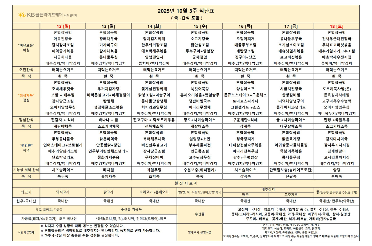 서초빌리지 서초빌리지 2025년 10월 3주차 식단안내