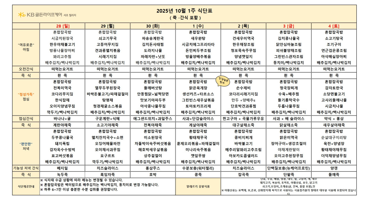 서초빌리지 서초 빌리지 2025년 10월 1주차 식단표