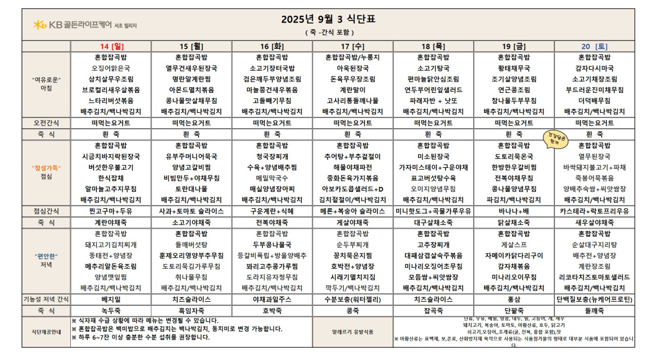 서초빌리지 서초빌리지 2025년 9월 3주차 식단표