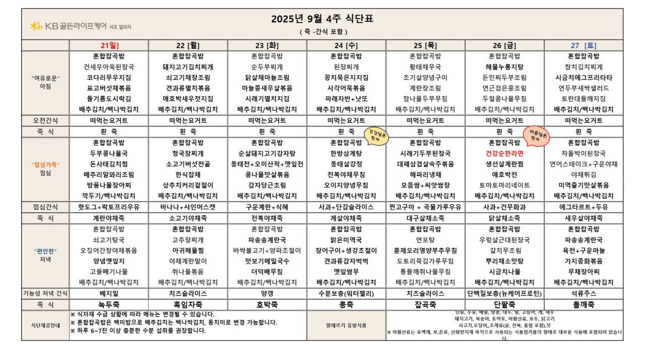 서초빌리지 서초빌리지 2025년 9월 4주차 식단표