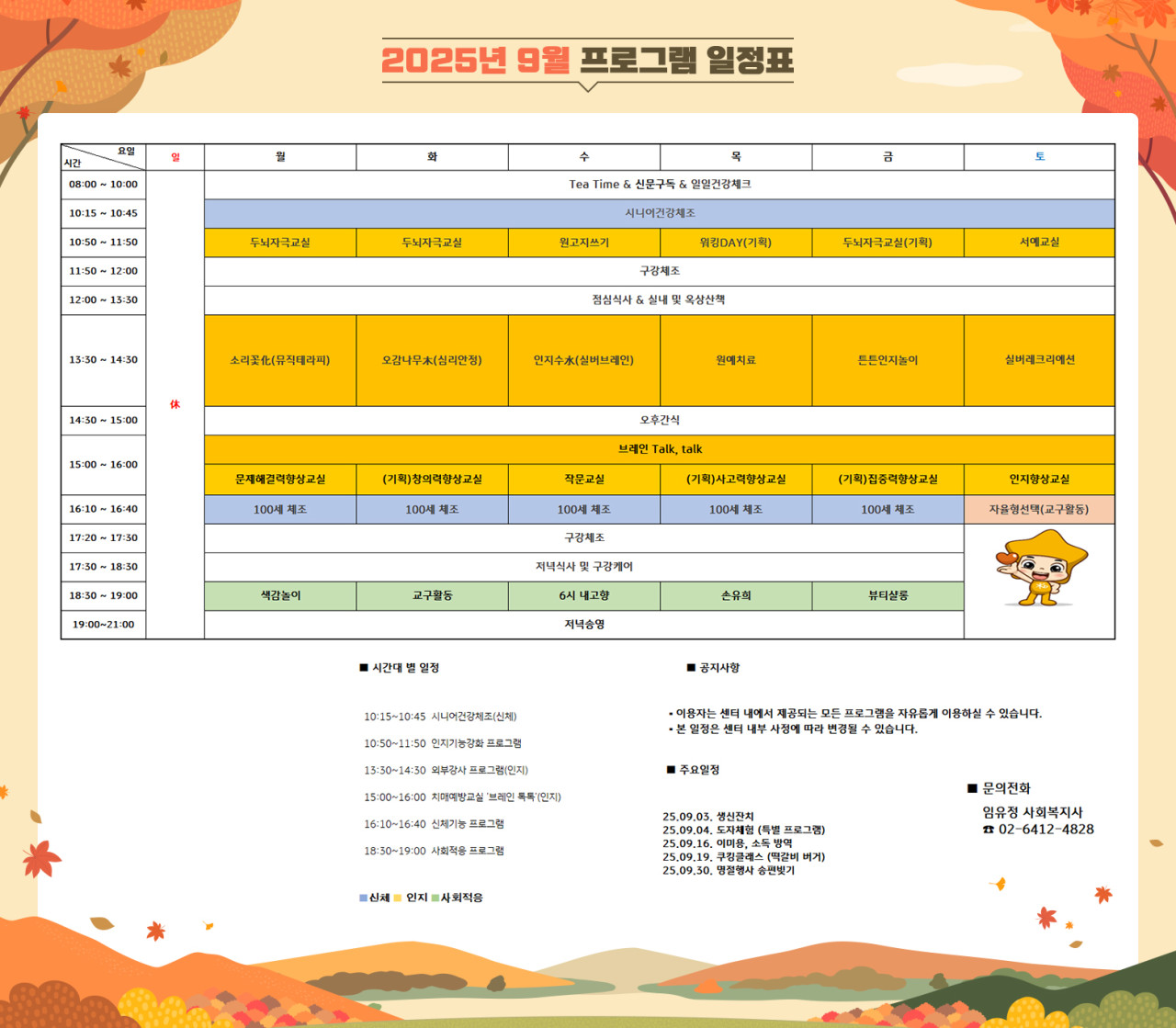 위례케어센터 [프로그램 안내] 2025년 위례케어센터 9월 프로그램 일정표 페이지 정보 작성자 최고관리자 댓글 0건 조회 2,957회 작성일 25-09-02 08:34 목록 본문 목록 이전글[하루의식단] 2025년 9월 2일 25.09.03 다음글[하루의식단] 2025년 8월 29일 25.08.31