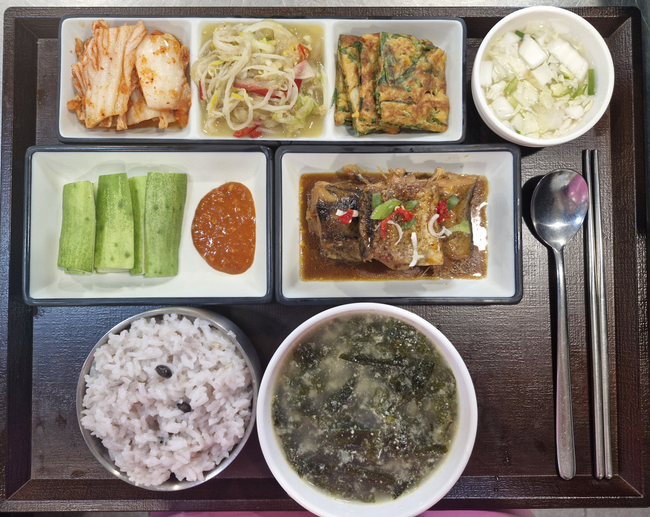 약콩밥 /  들깨미역국  /  코다리엿장조림 /  부추장떡  /   숙주해파리냉채  / 야채스틱 (쌈장) /  포기김치 / 나박김치