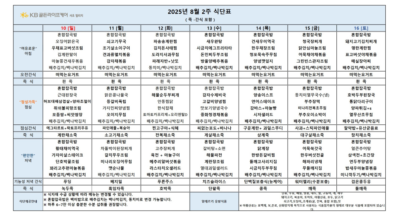 서초빌리지 서초 빌리지 2025년 8월 2주차 식단표